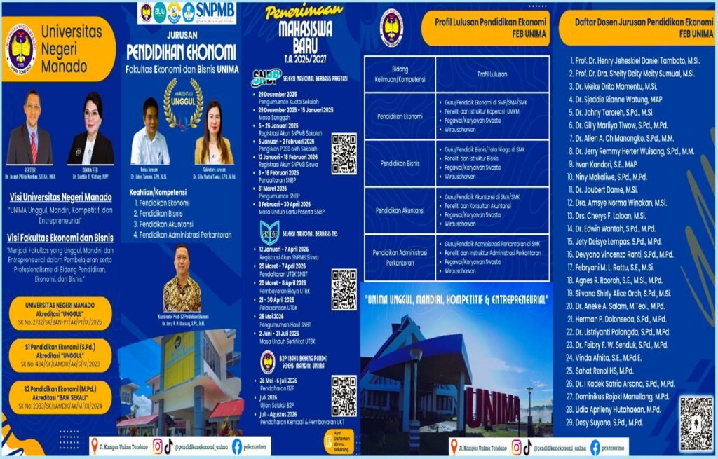 Jurusan Pendidikan Ekonomi Fakultas Ekonomi dan Bisnis Universitas Negeri Manado, dengan bangga menyambut Anda di fakultas kami. FEB UNIMA merupakan salah satu fakultas terkemuka di UNIMA yang berkomitmen untuk menghasilkan lulusan yang unggul dalam bidang ekonomi dan bisnis.